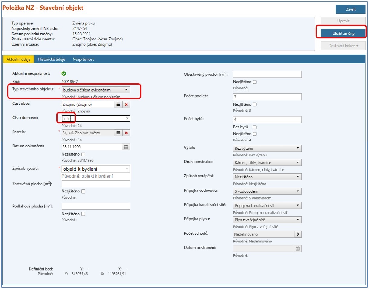 Pozn.: Uvedený postup by platil analogicky i pro změnu stavebního objektu s číslem evidenčním na stavební objekt s číslem popisným. S tím rozdílem, že by se při vyhledávání stavebního objektu a adresního místa zadalo číslo evidenční.