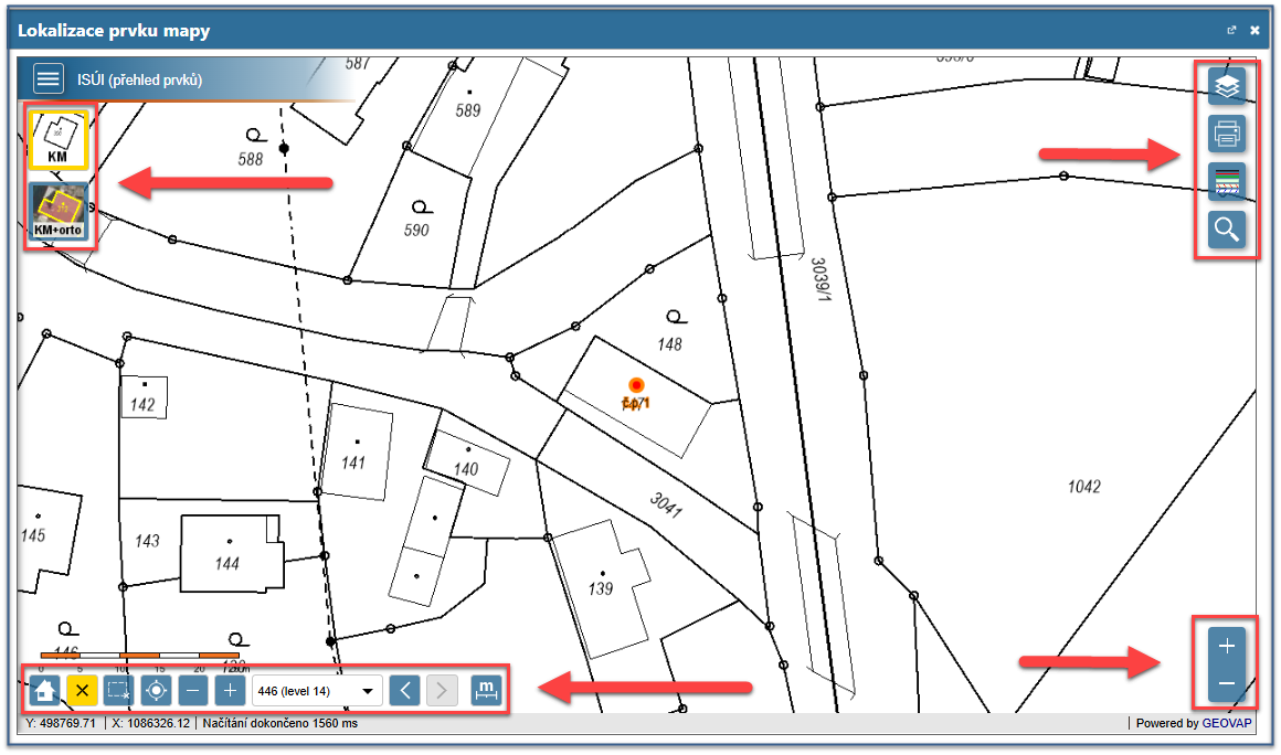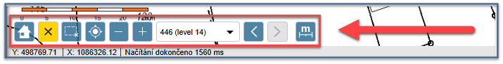Grafické okno lokalizace prvků mapy obsahuje 4 panely nástrojů pro ovládaní zobrazení mapy a nastavení obsahu mapových podkladů
