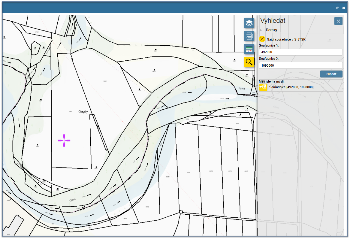 Po vyplnění souřadnic a kliknutí na tlačítko