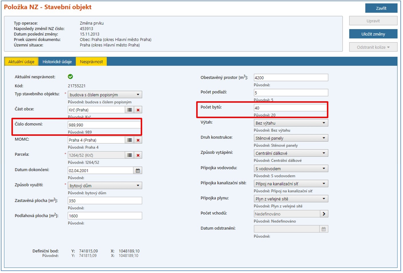 Stavební objekt (SO) s nejnižším číslem domovním bude zachován a budete provádět jeho změnu (Typ operace: Změna prvku). Další stavební objekt/y bude/ou zrušen/y (Typ operace: Zrušení prvku). Příslušná adresní místa všech dotčených stavebních objektů je nutné zachovat – načtěte je pro změnu (Typ operace: Změna prvku). Doporučujeme využít funkci z Hromadných operací (Načtení SO/AM do NZ), která ke stavebním objektům v NZ automaticky načte jejich adresní místa pro změnu.
