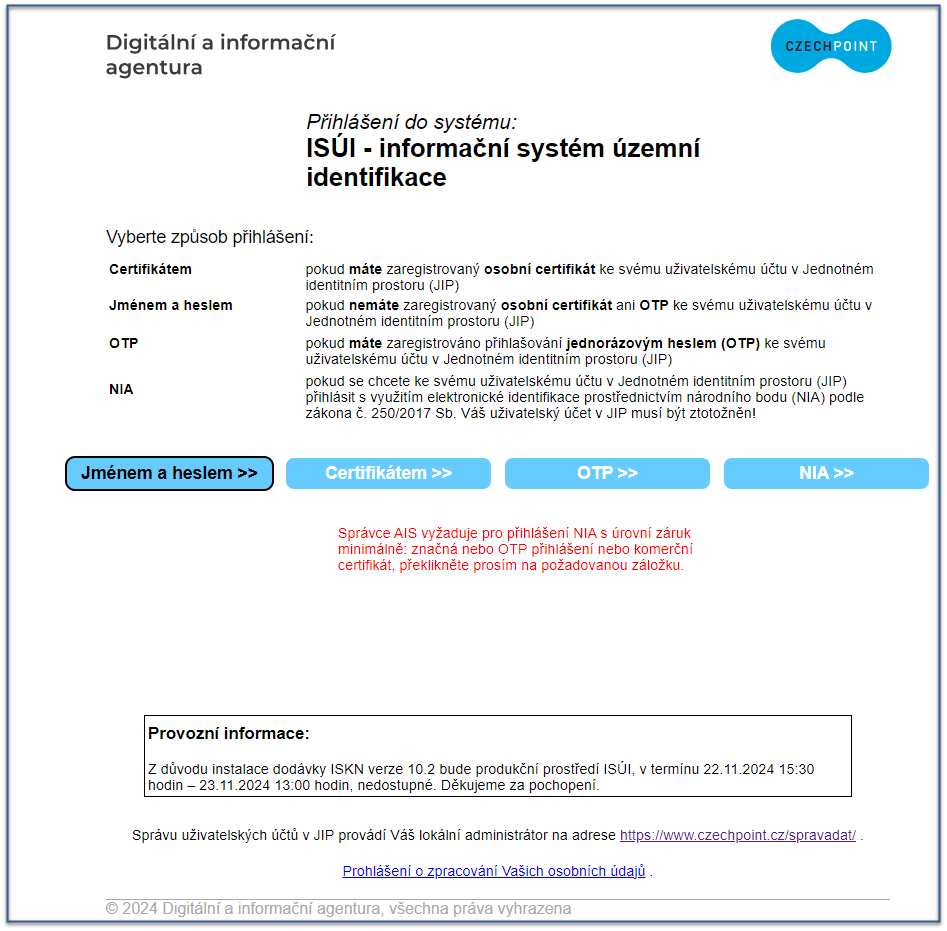 Od 28. 5. 2019 již není možné se přihlašovat do ISÚI pouze pomocí jména a hesla, ale je nutné k nim přidat další bezpečnostní prvek: certifikát nebo OTP. Důvodem je termín účinnosti vyhlášky č. 82/2018 Sb., (vyhláška o kybernetické bezpečnosti), § 19 odst. 3.