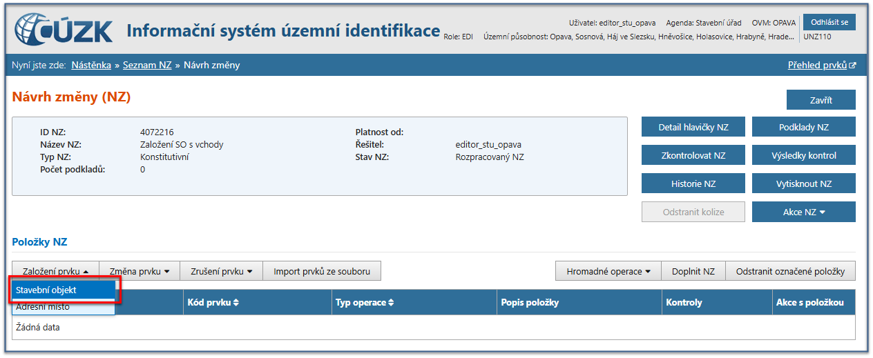 Pro založení prvku stavební objekt je možné si založit nový NZ. Do návrhu změny přidejte potřebný/é podklad/y v Detailu hlavičky NZ (obrazovka UNZ111).
