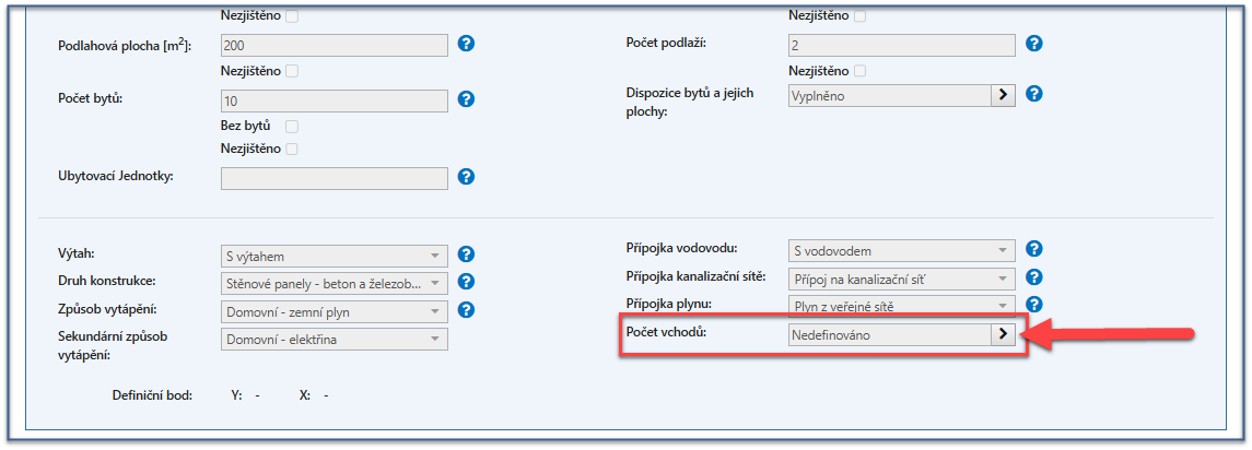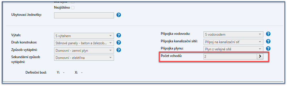 Jedná se o stavební objekt s vchody , které lze definovat až nyní (při úvodní editaci byla volba "Počet vchodů" neaktivní, viz obrázek výše).