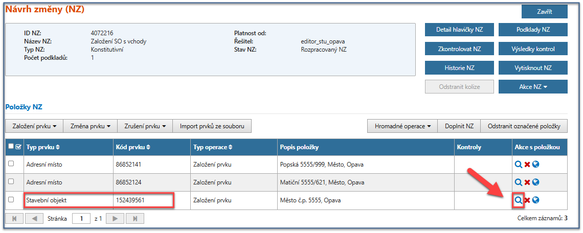 Nyní máme v návrhu změny připraveno založení číslovaného stavebního objektu s definicí dvou vchodů. Pro zapsání této editace do RÚIAN je nutné NZ zkontrolovat systémem a nakonec NZ schválit – viz Kontroly NZ, Schválení NZ.