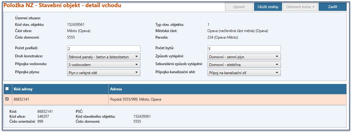 V detailu vchodu Stavební objekt – detail vchodu [UNZ166] musíme editovat počet podlaží, počet bytů příp. další technicko-ekonomické atributy dle podkladů. Technicko-ekonomické atributy alespoň jednoho vchodu musí přesně odpovídat hlavním technicko-ekonomickým atributům stavebního objektu. Ke vchodu je nutné přiřadit adresní místo, které jsme si postupem viz výše v návrhu změny založili. Definici je nutné uložit.