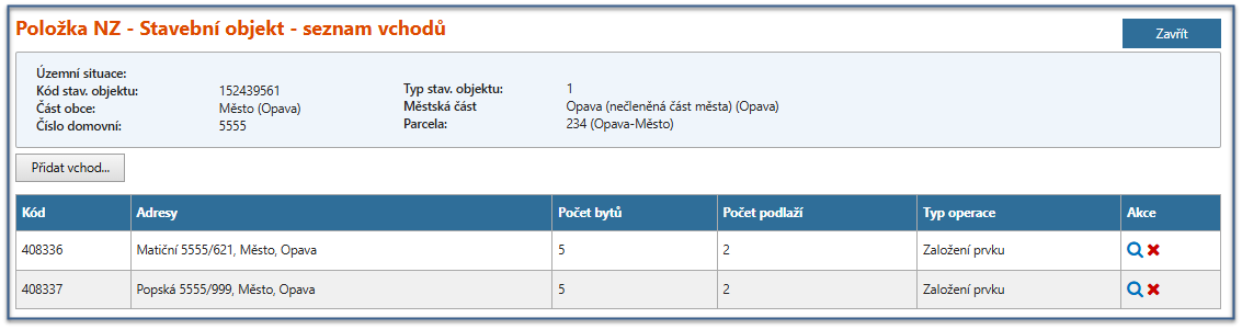 Otevře se formulář Stavební objekt – seznam vchodů [UNZ165] a lze definovat jednotlivé vchody volbou "Přidat vchod"