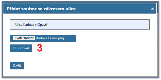 Je nutné zadat popis importovaného souboru a zvolit soubor z lokálního úložiště se zákresem definiční čáry ulice. Povoleny jsou jen soubory s příponou PDF, PNG, JPG, DGN, DWG, DXF, SHP, PRJ, DBF, SHX a JSON a maximální povolená velikost souborů je 20 MB.