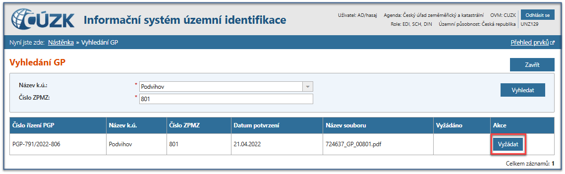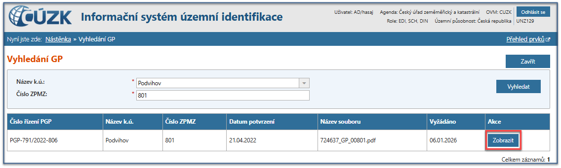 Ve spodní části pak formulář zobrazí vyžádané GP, které v poslední době vyhledali uživatelé z jeho OVM (seznam je setříděný sestupně podle data vyžádání). Tyto soubory je možné také zobrazit.